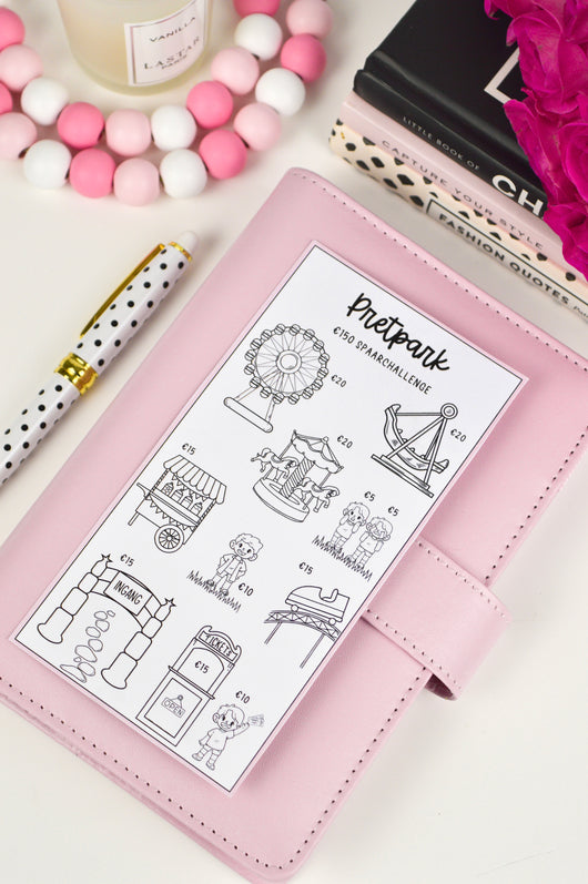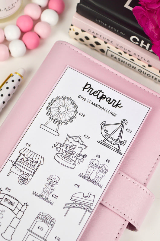 Spaar jij voor een dag vol plezier in een pretpark? Met deze Pretpark Spaarchallenge leg je stap voor stap €150 opzij. Op de kaart staan verschillende bedragen bij attracties, de ticketkraam en foodstands, zodat je op een leuke en overzichtelijke manier kunt sparen. Kruis de bedragen af en maak je klaar voor een geweldige pretparkervaring!
